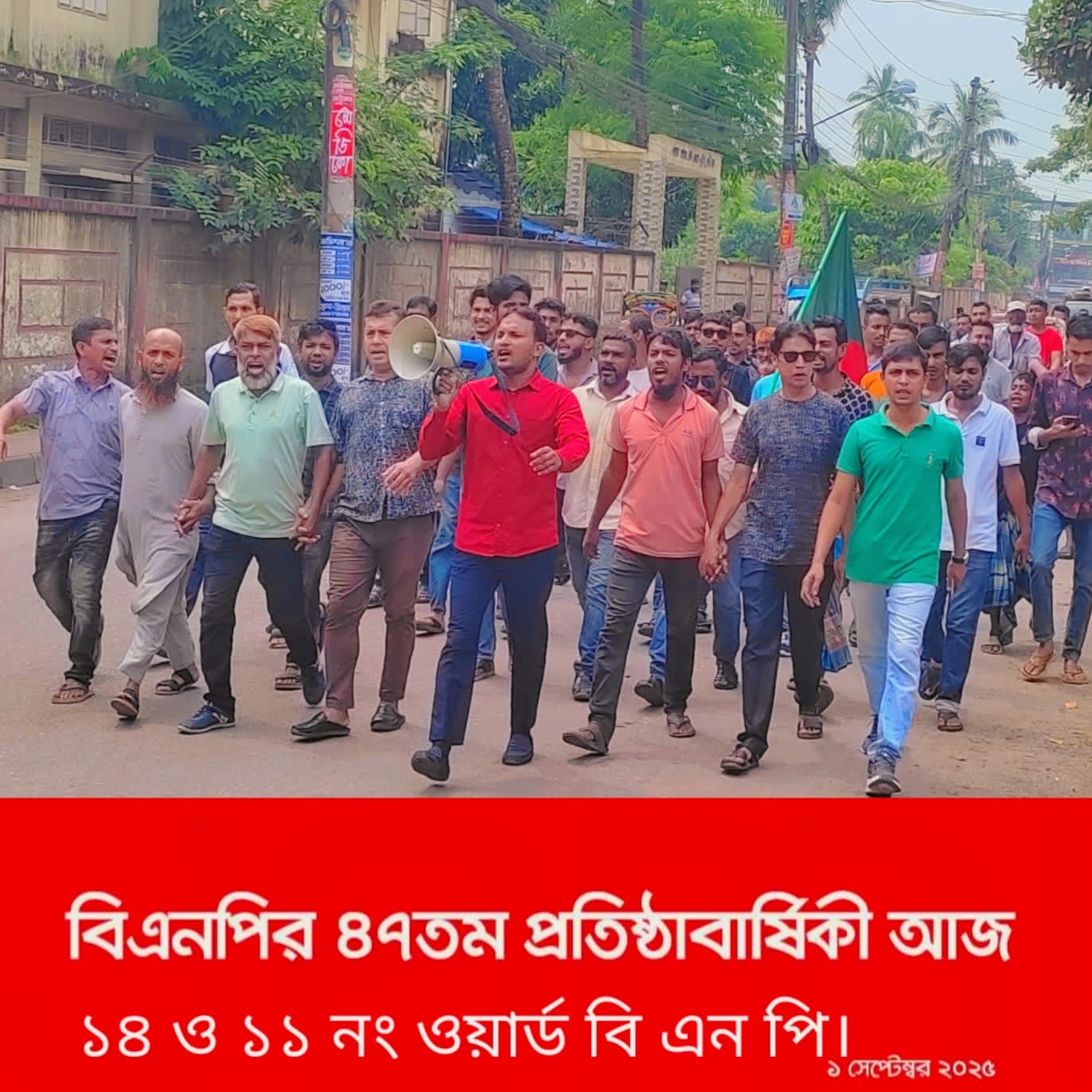 বিএনপি র ৪৭ তম প্রতিষ্ঠা বার্ষিকী উপলক্ষে বরিশালে ১৪নং ওয়ার্ডের উদ্যোগে বর্ণাঢ্য শোভাযাত্রা ও র্যালি অনুষ্ঠিত। ১ আগস্ট সকাল ১০ টায় নগরীর টাউন হল বিএনপি কার্যালয়ের সামনে দিয়ে বরিশাল মহানগর বিএনপি র সাবেক সদস্য সচিব অ্যাডভোকেট : মীর জাহিদুল কবির জাহিদ এর নেতৃত্বে প্রতিষ্ঠাবার্ষিকীর বর্ণাঢ্য শোভাযাত্রা ও র্যালি অনুষ্ঠিত হয়। এসময় র্যালিতে যোগদান করেন ১১ নং ও ১৪ নং ওয়ার্ড এর বিএনপির নেতৃবৃন্দ।